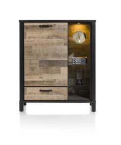 стилен и модерен рустикален шкаф – подходящ както за трапезария, така и за дневна – с удобно разпределение на място за съхранение; изработен от Primo laminato / ламиниран фурнир / – устойчив на драскотини и лесен за поддържане и почистване материал, почти неразличим от дървото; в цвят driftwood, който хармонира великолепно с черните метални акценти; с топло LED – осветление на отворените ниши;