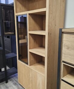 висок шкаф с изчистени линии; съчетание от модерен дизайн и естествена елегантност; изработен от масив фурнир дъб в топли натурални тонове; лаковото покритие платина има матиращ ефект и осигурява изключителна издържливост