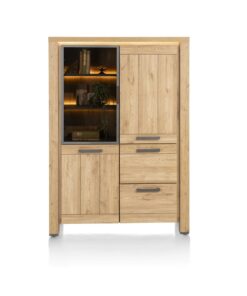 класическата визия на колекция Delmonte се подчертава от интегрираните на задната страна на рафтовете LED ленти зад стъклената вратичка на витрината; изработен от Primo laminato / ламиниран фурнир / – устойчив на драскотини и лесен за поддръжка и почистване материал, почти неразличим от дървото в цвят дъб натур; в допълнение шкафът има и LED лента с вграден тъч димер с възможност сами да регулирате интензивността на светлината, която отговаря на Вашето настроение; перфектно се вписва в рустикалния интериор