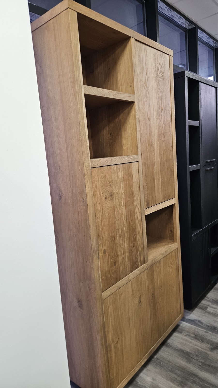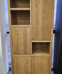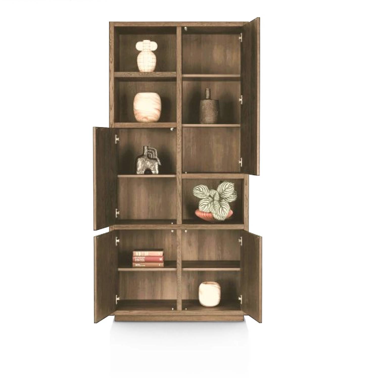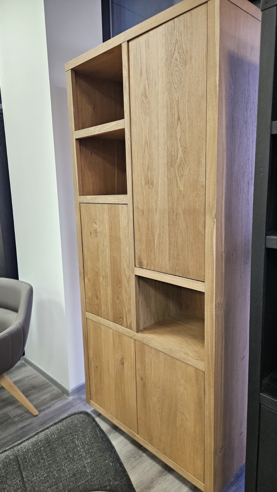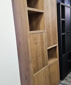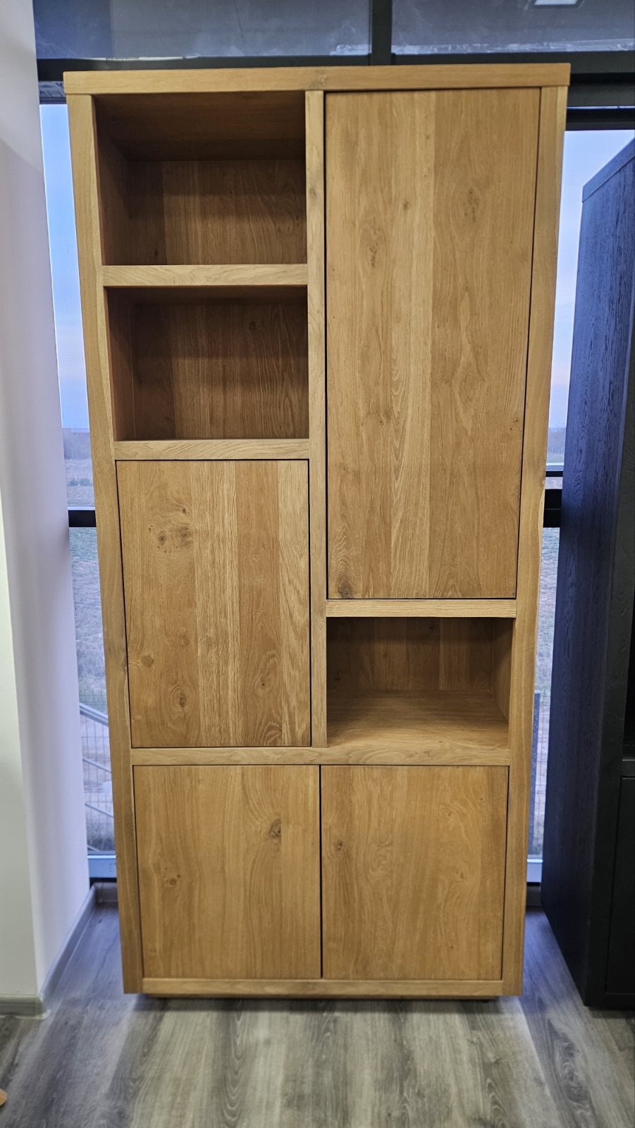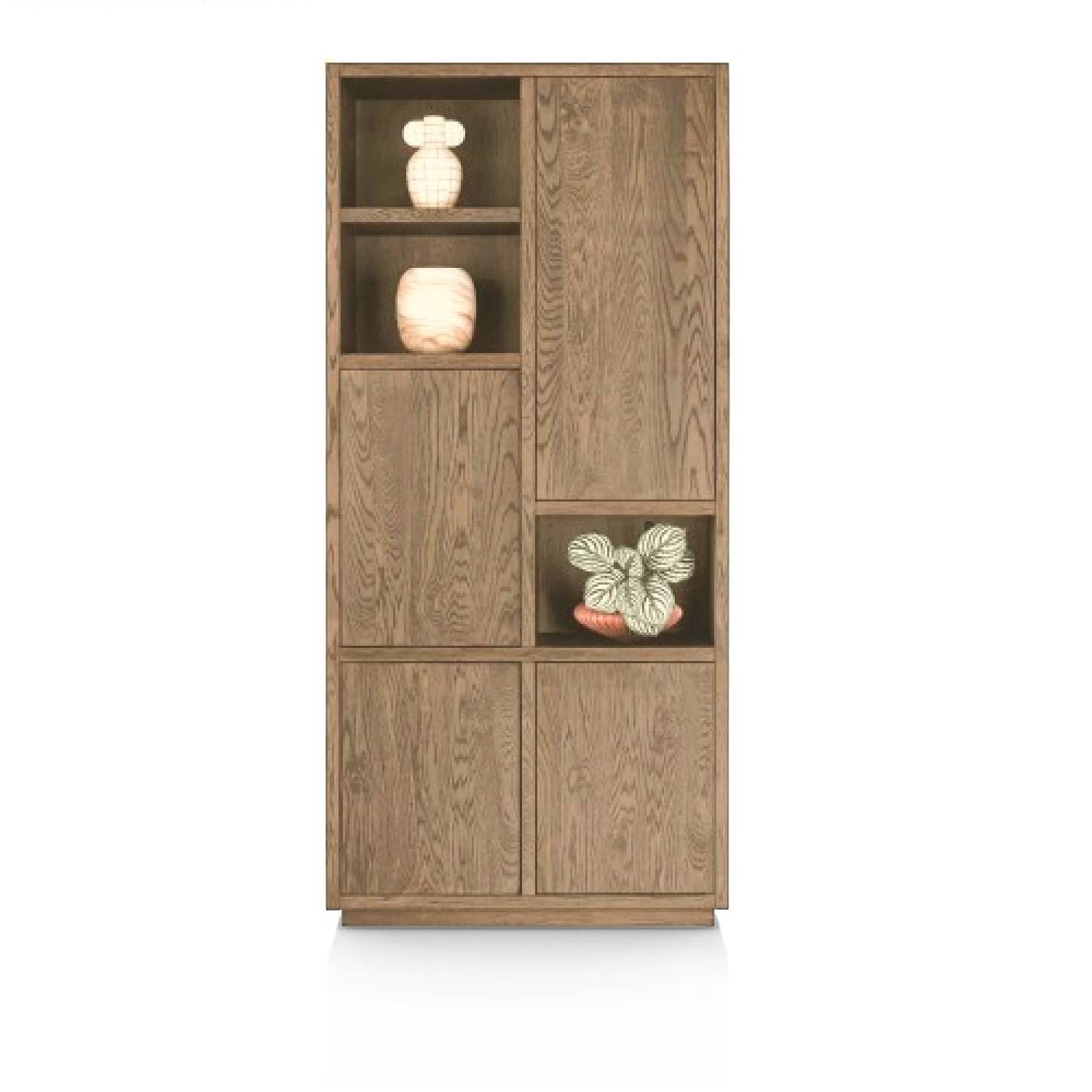 висок шкаф с модерен дизайн и естествена елегантност; изработен от масив фурнир дъб в топли натурални тонове; лаковото покритие платина има матиращ ефект и осигурява изключителна издържливост