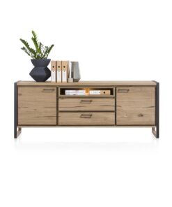 сайдборд, който се отличава с характерната за дъбовия масив фурнир уникална повърхност, и черни метални профили на вратичките и чекмеджетата; в стил индъстриъл